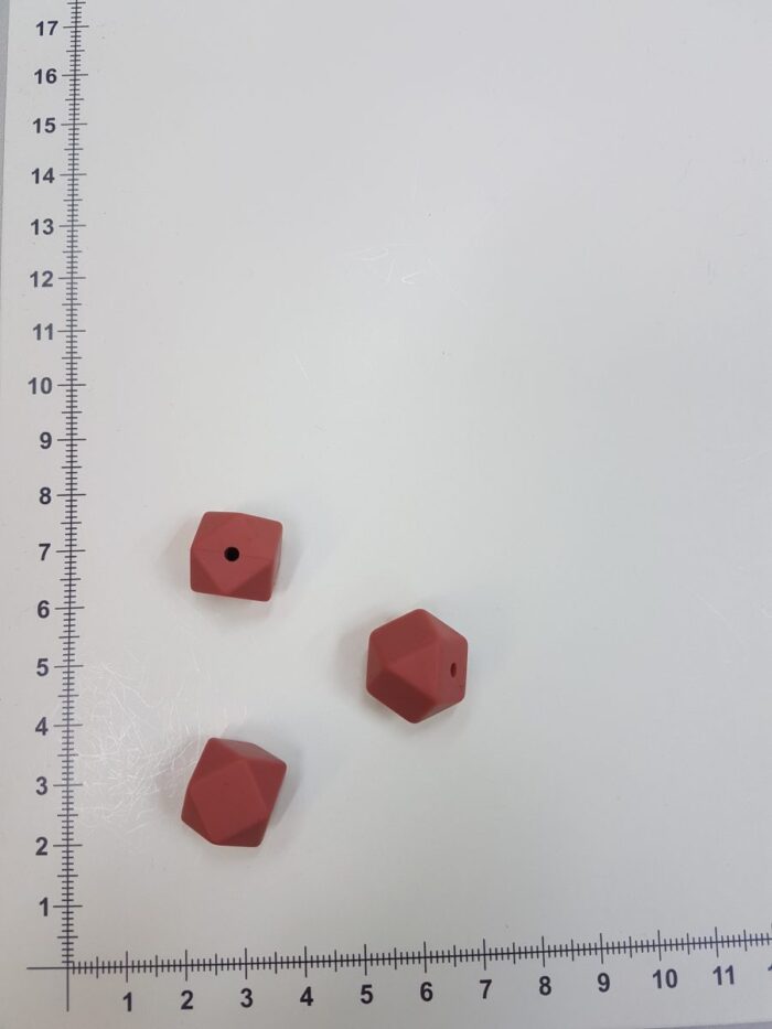 Silikoninis šešiakampis 14 mm, Plytinis yra skirtas rankdarbims. Dažniausiai naudojamas verti kūdikio čiultuko laikikliui. Silikoniniai čiulptukų laikikliai tampa vis madingesni, nes yra daug patogesni priežiūros atžvilgiu, tuo pačiu malonesni patiems kūdikiams. Silikoniniai karoliukai yra minkšti, pagaminti iš saugaus maistinio silikono, be BPA, fosfatų, švino ir kitų kenksmingų medžiagų. Karoliukai atsparūs seilėms ir kitai drėgmei. Tai puiki pagalbinė priemonė dygstantiems dantukams. Minkštas silikonas nepažeidžia dantenų ir mažina diskomfortą dantukų dygimo laikotarpiu. Šiuos karoliukus galima naudoti ir papuošalų gamyboje: apyrankės, karoliai, įvairūs papuošaliukai, pagaminti iš silikoninių karoliukų atrodo žavingai, yra ilgalaikiai, o jų priežiūra nesudėtinga. Silikoninių karoliukų turime įvairaus skersmens (nuo 9 mm iki 19 mm), įvairių spalvų bei formų. Kūdikiui šiuos karoliukus lytėti yra saugu ir naudinga – liečiant skirtingas formas mažylis susipažįsta su pasauliu, plečia vaizduotę, taip lavėja ir jo smulkioji motorika. Išsirinkite karoliukus ir sukurkite išskirtinį čiulptuko ar kramtuko laikiklį savo kūdikiui! Silikoninis šešiakampis karoliukas yra nelygiu pavišiumi, kampuotas, tačiau saugus kūdikiui. Karoliukas per vidurį turi vėrimo skylutę.