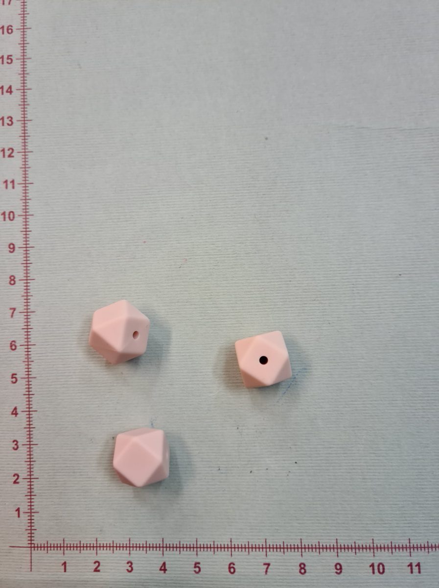 Silikoninis šešiakampis 14 mm, Švelnus persikinis yra skirtas rankdarbims. Dažniausiai naudojamas verti kūdikio čiultuko laikikliui. Silikoniniai čiulptukų laikikliai tampa vis madingesni, nes yra daug patogesni priežiūros atžvilgiu, tuo pačiu malonesni patiems kūdikiams. Silikoniniai karoliukai yra minkšti, pagaminti iš saugaus maistinio silikono, be BPA, fosfatų, švino ir kitų kenksmingų medžiagų. Karoliukai atsparūs seilėms ir kitai drėgmei. Tai puiki pagalbinė priemonė dygstantiems dantukams. Minkštas silikonas nepažeidžia dantenų ir mažina diskomfortą dantukų dygimo laikotarpiu. Šiuos karoliukus galima naudoti ir papuošalų gamyboje: apyrankės, karoliai, įvairūs papuošaliukai, pagaminti iš silikoninių karoliukų atrodo žavingai, yra ilgalaikiai, o jų priežiūra nesudėtinga. Silikoninių karoliukų turime įvairaus skersmens (nuo 9 mm iki 19 mm), įvairių spalvų bei formų. Kūdikiui šiuos karoliukus lytėti yra saugu ir naudinga – liečiant skirtingas formas mažylis susipažįsta su pasauliu, plečia vaizduotę, taip lavėja ir jo smulkioji motorika. Išsirinkite karoliukus ir sukurkite išskirtinį čiulptuko ar kramtuko laikiklį savo kūdikiui! Silikoninis šešiakampis karoliukas yra nelygiu pavišiumi, kampuotas, tačiau saugus kūdikiui. Karoliukas per vidurį turi vėrimo skylutę.