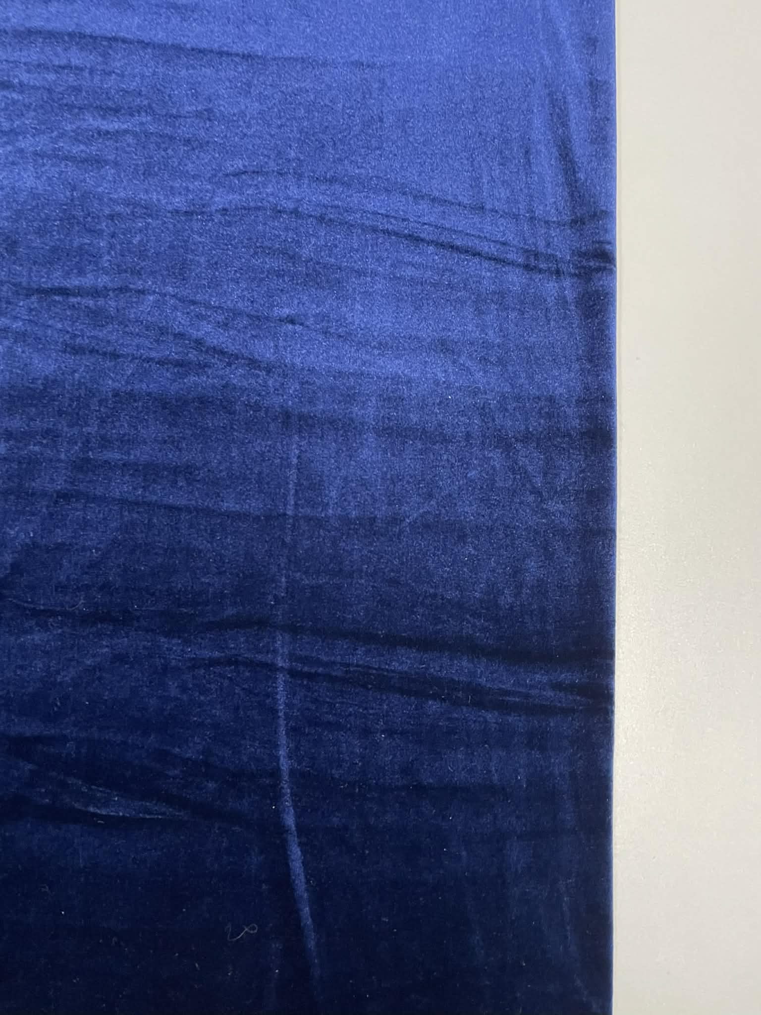 Sintetinis veliūras Rašalo mėlynas – švelnus ir minkštas, malonus liesti, labai komfortiškas, lengvas, gaminamas iš pavienių karštinių verpalų. Būdingas tankus trumpų pūkų paviršius. Veliūras – prabangi ir lepinanti medžiaga su minkštu pūkeliu, blizganti, dėvisi maloniai, atrodo prabangiai. Trikotažas labai tvirtas ir elastingas, atsparus susidėvėjimui, nepraranda formos ir puikiai šildo šaltu oru. Dėl šių savybių naudojamas moteriškiems ir vyriškiems paltams, kepurėms, šalikams, sportiniams kostiumams, sijonams, švarkeliams ar suknelėms siūti. Iš jo pasiūtos suknelės yra itin puošnios, juo vilkinti dama atrodo kaip karalienė. Vis dėl to, veliūro pūkeliai laikui bėgant nusitrina, todėl šiam audiniui reikia rūpestingos priežiūros. Šios medžiagos rūbai yra linkę sugerti dulkes. Todėl mažas dėmes rekomenduojame valyti sudrėkinta ir gerai nusausinta porolonine kempine. Galima skalbti ir skalbyklėje, tačiau kad gaminys neprarastų savo spalvos, kokybės ir formos nerekomenduojame skalbiant viršyti 30 °C temperatūros.