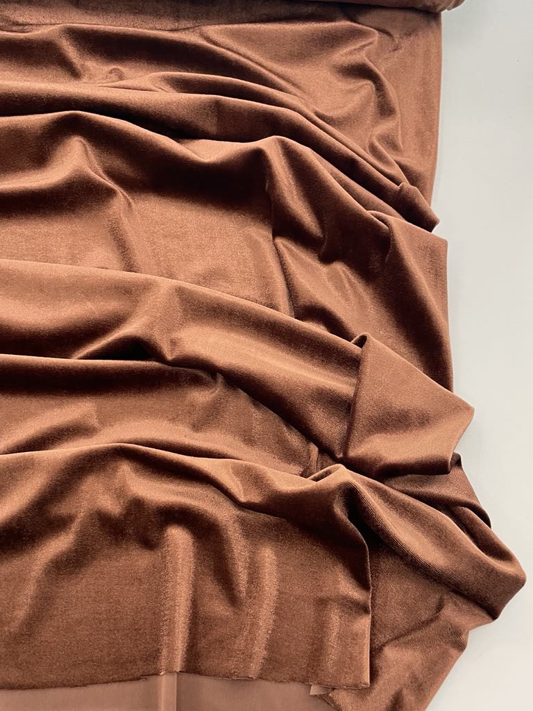 Sintetinis veliūras Rudas – švelnus ir minkštas, malonus liesti, labai komfortiškas, lengvas, gaminamas iš pavienių karštinių verpalų. Būdingas tankus trumpų pūkų paviršius. Veliūras – prabangi ir lepinanti medžiaga su minkštu pūkeliu, blizganti, dėvisi maloniai, atrodo prabangiai. Trikotažas labai tvirtas ir elastingas, atsparus susidėvėjimui, nepraranda formos ir puikiai šildo šaltu oru. Dėl šių savybių naudojamas moteriškiems ir vyriškiems paltams, kepurėms, šalikams, sportiniams kostiumams, sijonams, švarkeliams ar suknelėms siūti. Iš jo pasiūtos suknelės yra itin puošnios, juo vilkinti dama atrodo kaip karalienė. Vis dėl to, veliūro pūkeliai laikui bėgant nusitrina, todėl šiam audiniui reikia rūpestingos priežiūros. Šios medžiagos rūbai yra linkę sugerti dulkes. Todėl mažas dėmes rekomenduojame valyti sudrėkinta ir gerai nusausinta porolonine kempine. Galima skalbti ir skalbyklėje, tačiau kad gaminys neprarastų savo spalvos, kokybės ir formos nerekomenduojame skalbiant viršyti 30 °C temperatūros.
