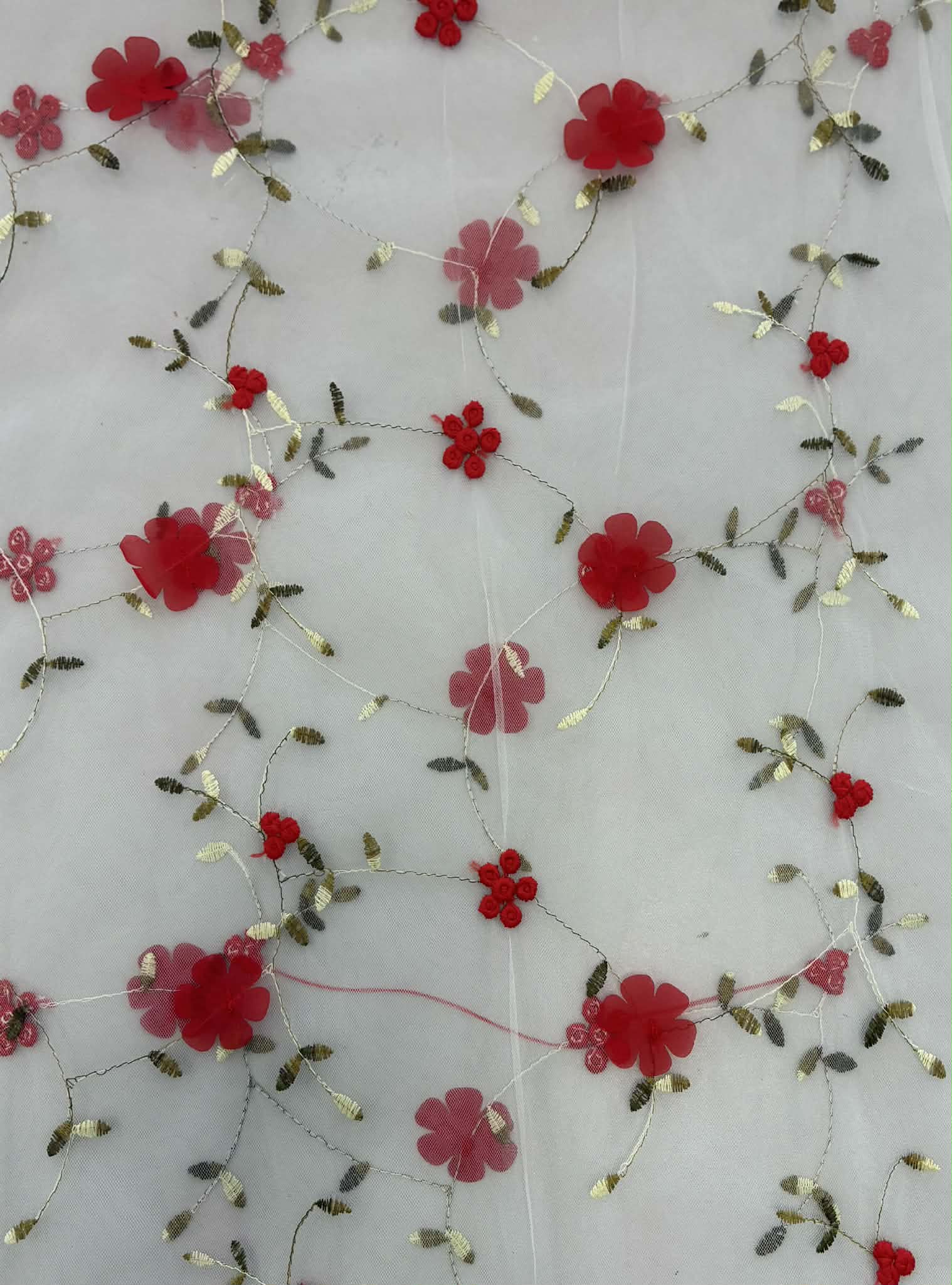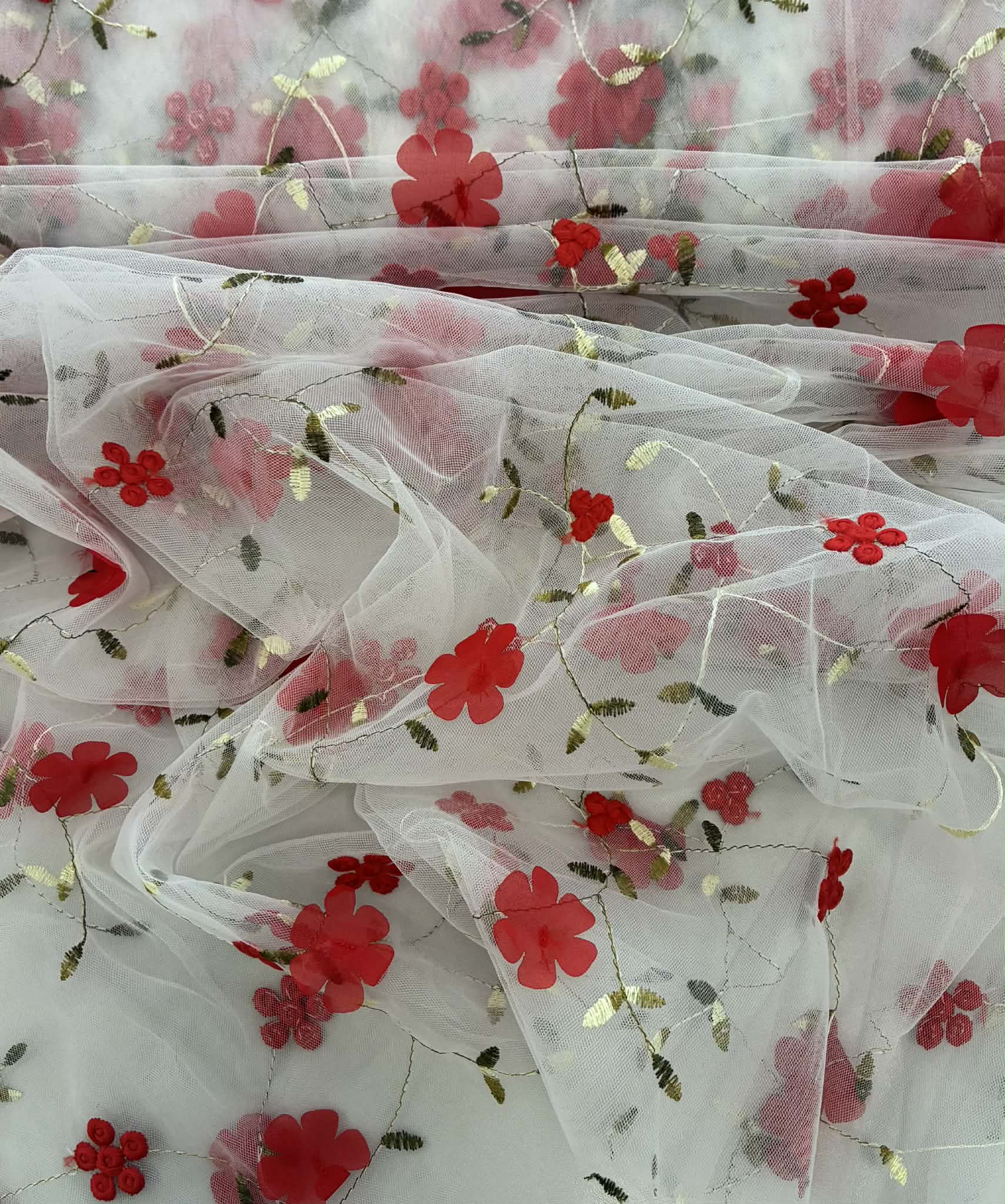 Siuvinėtas tiulis su raudonomis gėlytėmis, pieno baltumo