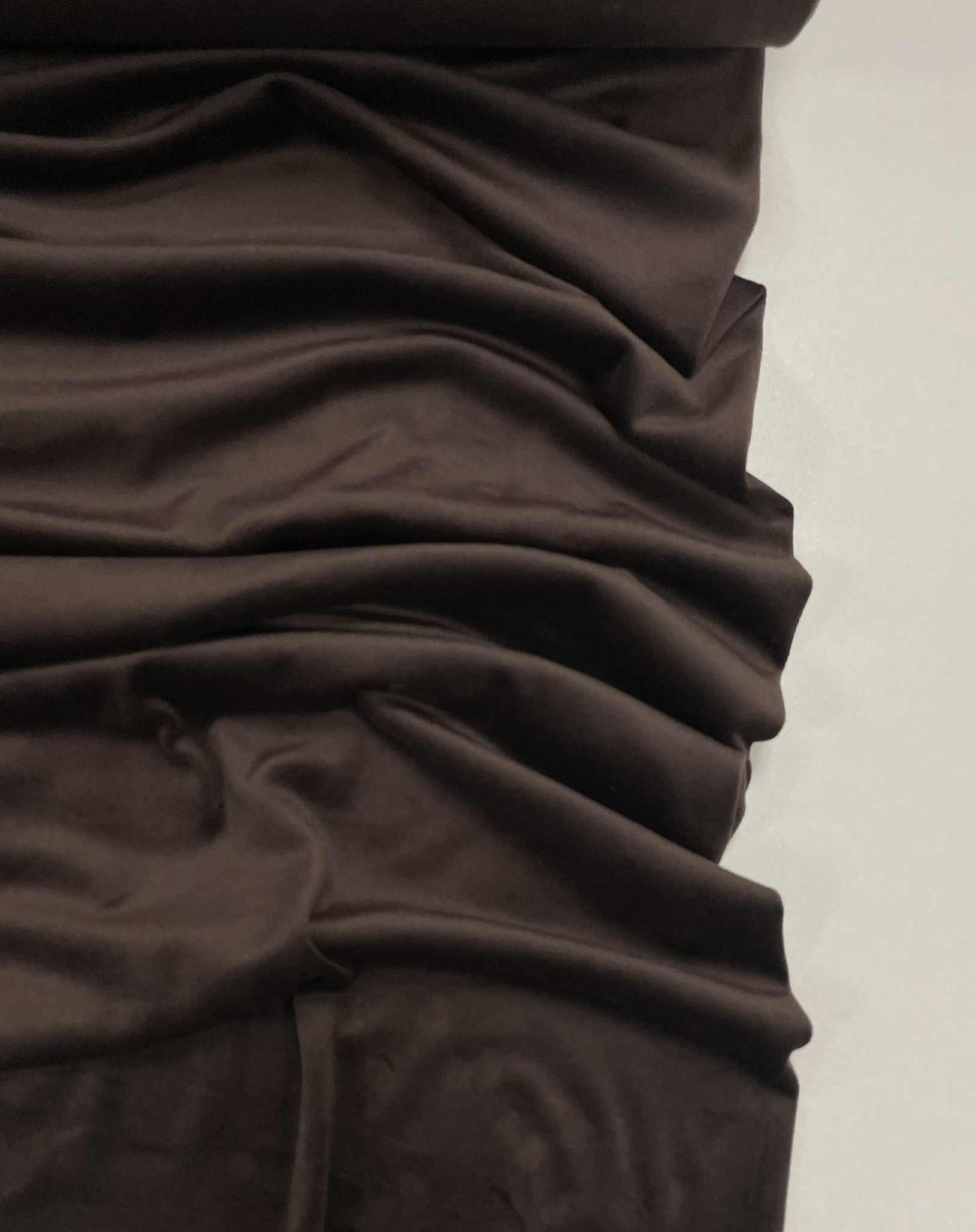 Soft veliūras Šokolado ruda – itin švelnus ir minkštas, labai malonus liesti, turbūt pats populiariausias iš visų veliūrų šiuo metu. Būdingas purus ilgesnių pūkų paviršius, kurių dėka medžiaga yra itin minkšta, maloni liesti ir dėvėti. Trikotažas labai tvirtas ir ypač elastingas, neturi blizgesnio, malonus, purus, minkštas. Dėl šių savybių naudojamas moteriškiems ir vyriškiems, bei vaikiškiems rūbams, kepurėms, šalikams, sportiniams kostiumams, sijonams, švarkeliams ar suknelėms siūti. Iš jo pasiūti rūbai puikiai tiks naudoti  kasdienai, nesudėtinga veliūro priežiūra suteiks rūbui ilgaamžiškumo. Galima skalbti ir skalbyklėje, tačiau kad gaminys neprarastų savo spalvos, kokybės ir formos nerekomenduojame skalbiant viršyti 30 °C temperatūros.