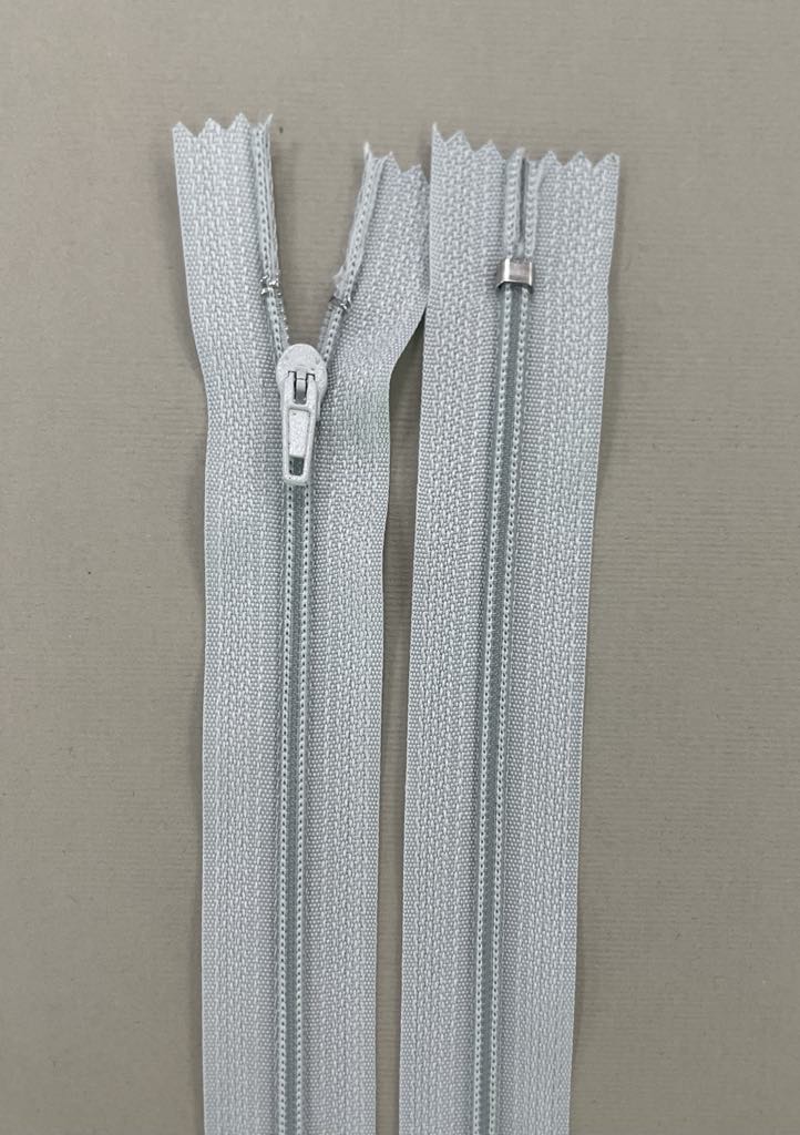 Spiralinis neišsegamas užtrauktukas „Šviesiai pilkas”, 50 cm . Gali būti naudojamas sijonų, suknelių, kelnių siuvime, taip pat kaip dekoracija.