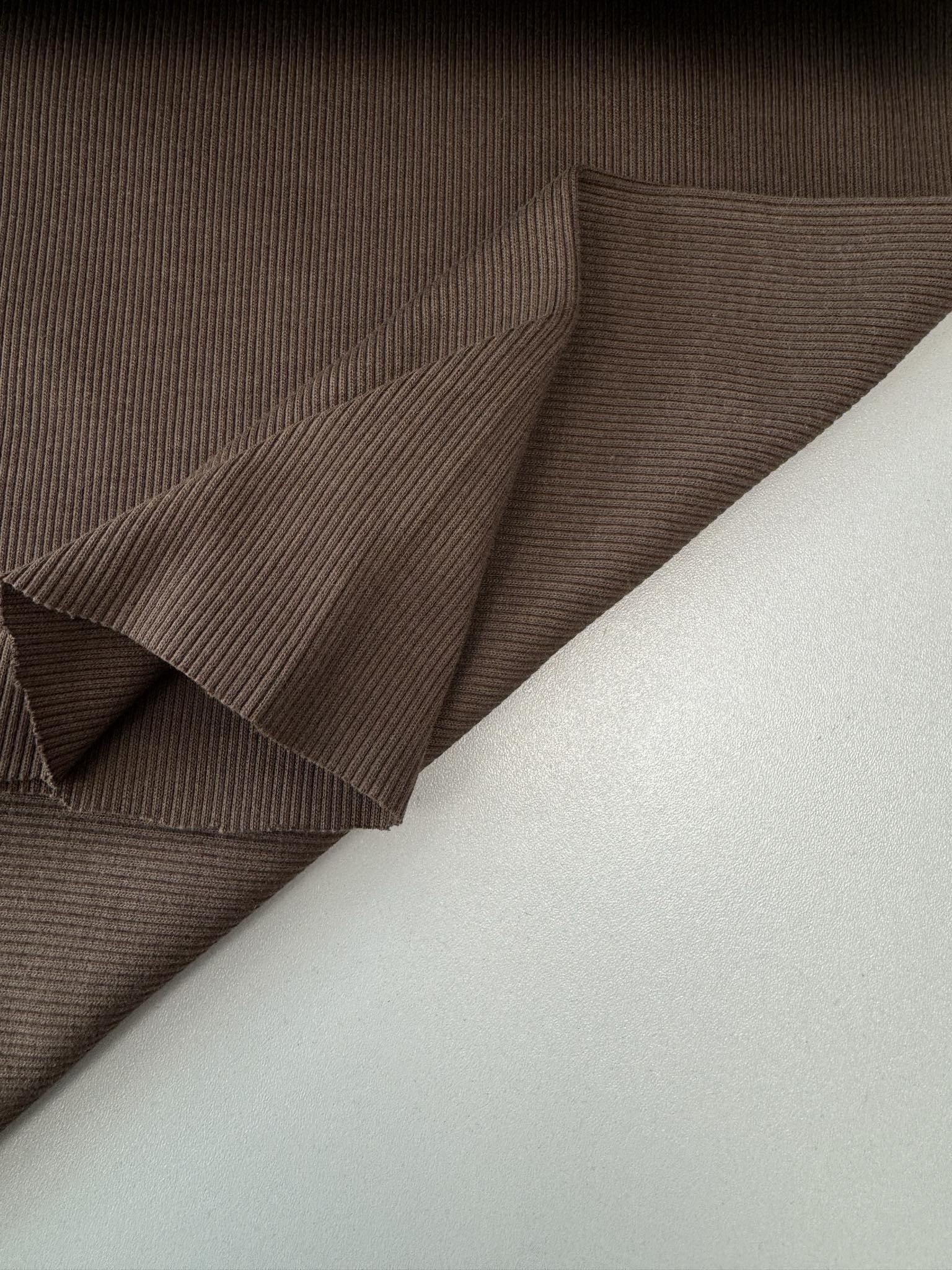 Storas Rib trikotažas Brown 23-03 – labai elastingas medvilninis audinys, panašus į megztą gumą. Trikotažas gaminamas iš medvilnės, tačiau jo sudėtyje yra nemažai elastano. Elastanas suteikia trikotažui daugiau tamprumo, o pasiūtam rūbui padeda išsaugoti pradinę formą. Rib trikotažas ne tik natūralus bei malonus, bet ir gerai sugeria bei išgarina drėgmę. Šis trikotažas dažniausiai naudojamas rūbų apdailai – rankogaliams, apykaklėms, kelnių klešnių apačioms užbaigti, ir pan. Kelnių juosmuo, apsiūtas šiuo elastingu trikotažu laikysis tvirčiau ant klubų. Pižamos rankogaliai ir kelnių apačia apsiūta tampriu trikotažu vaikučiui nesmuks ir jo neerzins, vaikas jausis patogiai ir maloniai. Tačiau iš šios medžiagos galima siūti ir sukneles, golfus, sijonus, bliuzonus, kepures. Rūbai iš šio trikotažo nesiglamžo, išskalbus išlaiko savo pradinę formą ir spalvą. Rib trikotažas internetu – tai aukščiausios kokybės, vidutinio storumo, tačiau ypatingai tamprus, minkštas, tvirtas ir malonus trikotažas. Kadangi šis trikotažas yra sertifikuotas, todėl tinkamas siūti ne tik suaugusiųjų rūbams, bet ir vaikams bei kūdikiams.