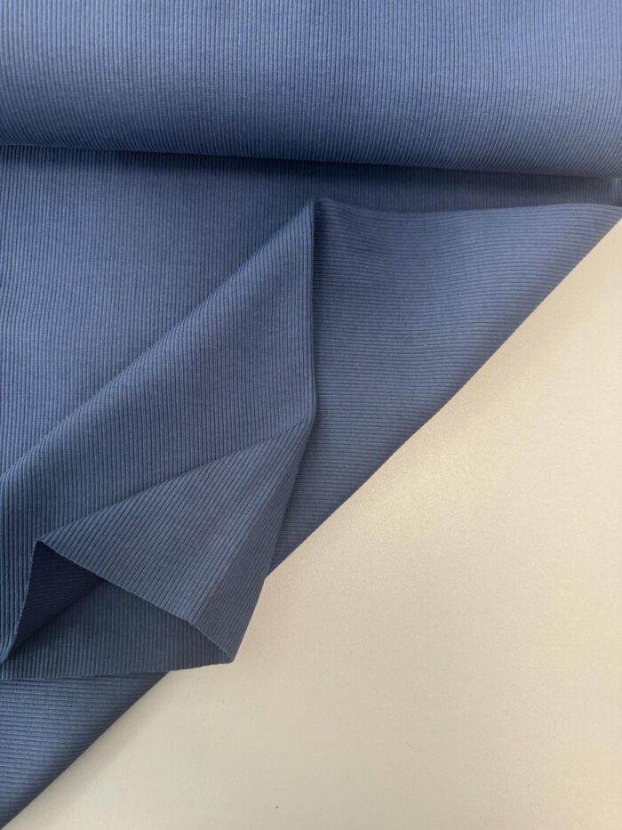 Storas Rib trikotažas Denim 20-01 – labai elastingas medvilninis audinys, panašus į megztą gumą. Trikotažas gaminamas iš medvilnės, tačiau jo sudėtyje yra nemažai elastano. Elastanas suteikia trikotažui daugiau tamprumo, o pasiūtam rūbui padeda išsaugoti pradinę formą. Rib trikotažas ne tik natūralus bei malonus, bet ir gerai sugeria bei išgarina drėgmę. Šis trikotažas dažniausiai naudojamas rūbų apdailai – rankogaliams, apykaklėms, kelnių klešnių apačioms užbaigti, ir pan. Kelnių juosmuo, apsiūtas šiuo elastingu trikotažu laikysis tvirčiau ant klubų. Pižamos rankogaliai ir kelnių apačia apsiūta tampriu trikotažu vaikučiui nesmuks ir jo neerzins, vaikas jausis patogiai ir maloniai. Tačiau iš šios medžiagos galima siūti ir sukneles, golfus, sijonus, bliuzonus, kepures. Rūbai iš šio trikotažo nesiglamžo, išskalbus išlaiko savo pradinę formą ir spalvą. Rib trikotažas internetu – tai aukščiausios kokybės, vidutinio storumo, tačiau ypatingai tamprus, minkštas, tvirtas ir malonus trikotažas. Kadangi šis trikotažas yra sertifikuotas, todėl tinkamas siūti ne tik suaugusiųjų rūbams, bet ir vaikams bei kūdikiams.
