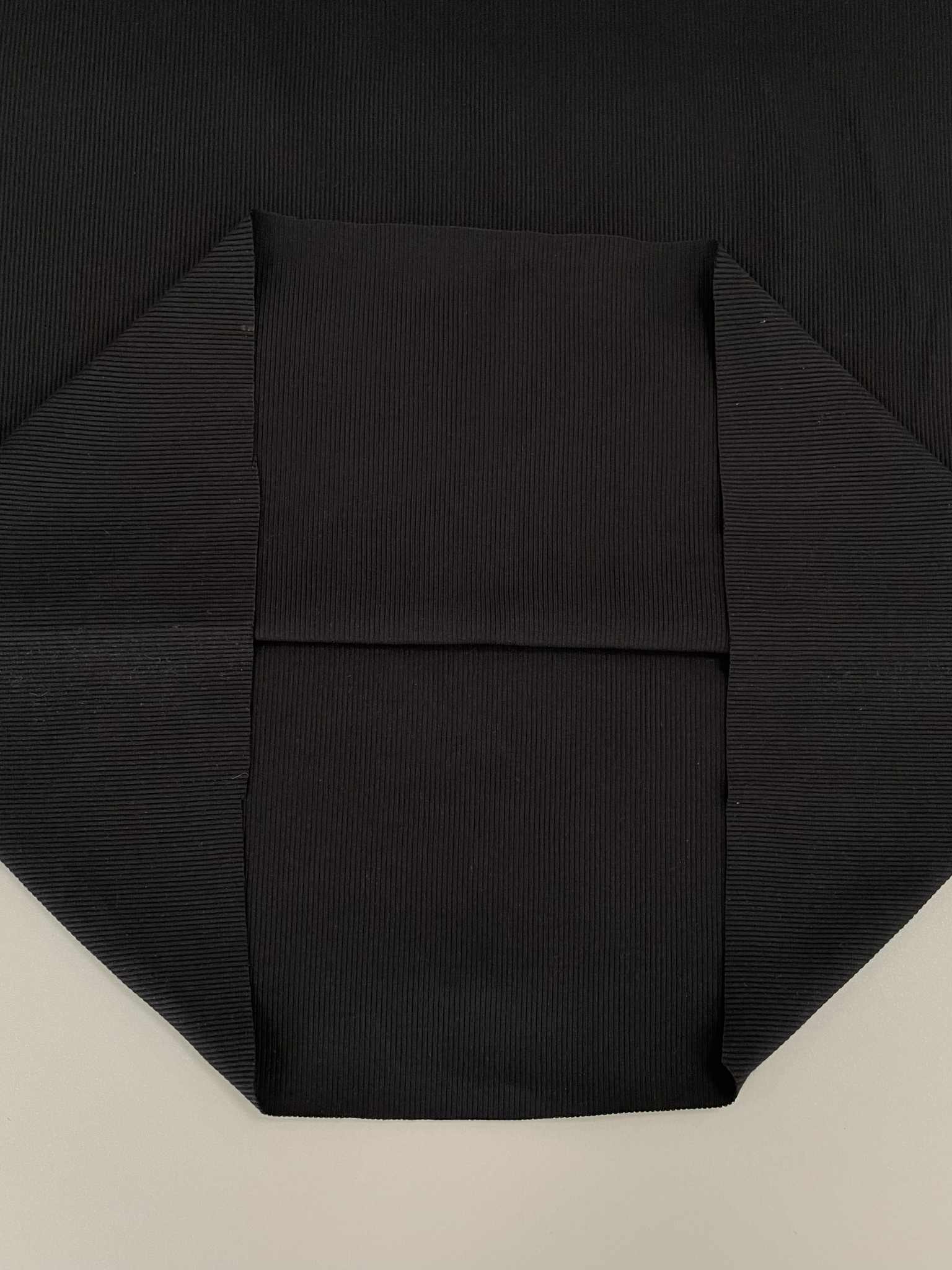 Storas Rib trikotažas Juodas – labai elastingas medvilninis audinys, panašus į megztą gumą. Audinys gaminamas iš medvilnės, tačiau jo sudėtyje yra nemažai elastano. Elastanas suteikia audiniui daugiau tamprumo, o pasiūtam rūbui padeda išsaugoti pradinę formą. Rib trikotažas ne tik natūralus bei malonus audinys, bet ir gerai sugeria bei išgarina drėgmę. Šis trikotažas dažniausiai naudojamas rūbų apdailai – rankogaliams, apykaklėms, kelnių klešnių apačioms užbaigti, ir pan. Kelnių juosmuo, apsiūtas šiuo elastingu trikotažu laikysis tvirčiau ant klubų. Pižamos rankogaliai ir kelnių apačia apsiūta tampriu trikotažu vaikučiui nesmuks ir jo neerzins, vaikas jausis patogiai ir maloniai. Tačiau iš šios medžiagos galima siūti ir sukneles, golfus, sijonus, bliuzonus, kepures. Rūbai iš šio trikotažo nesiglamžo, išskalbus išlaiko savo pradinę formą ir spalvą. Rib trikotažas internetu – tai aukščiausios kokybės, vidutinio storumo, tačiau ypatingai tamprus, minkštas, tvirtas ir malonus trikotažas. Kadangi šis trikotažas yra sertifikuotas, todėl tinkamas siūti ne tik suaugusiųjų rūbams, bet ir vaikams bei kūdikiams.
