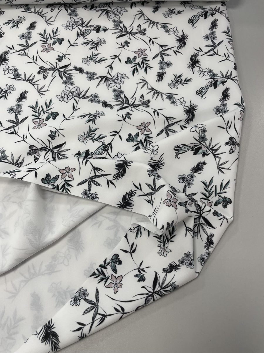Suknelinis Barbie audinys Baltas, juodos gėlytės– tai gražiai krentantis, šiek tiek elastingas, nepermatomas, praktiškai nesiglamžantis audinys. Barbie audinys neveltui yra vadinamas sukneliniu, nes pasirinkę jį suknelės siuvimui, o dar priderinus nėrinių ar gipiūro tikrai atrodys elegantiškai ir nereiks rūpintis dėl suknelės glamžymosi. Dar kartais šis audinys yra vadinamas Marchiano audiniu. Barbie medžiagos gramatūra gali būti įvairi, tačiau jis yra pakankamai tankus, nepersišviečiantis. Šį audinį labai lengva prižiūrėti, skalbti nesudėtinga, dėl savo sudėties jis greitai džiūsta. Be suknelių, iš jo galite pasiūti palaidinę, tuniką, sijoną, kelnės. Jis puikiai tiks tiek vasarinių tiek kitų sezonų rūbų siuvimui, tačiau margaspalviais raštais išmargintas barbie idealiausias vasarinei, vėjyje besiplaikstančiai suknelei, palaidinei ar ilgam sijonui.
