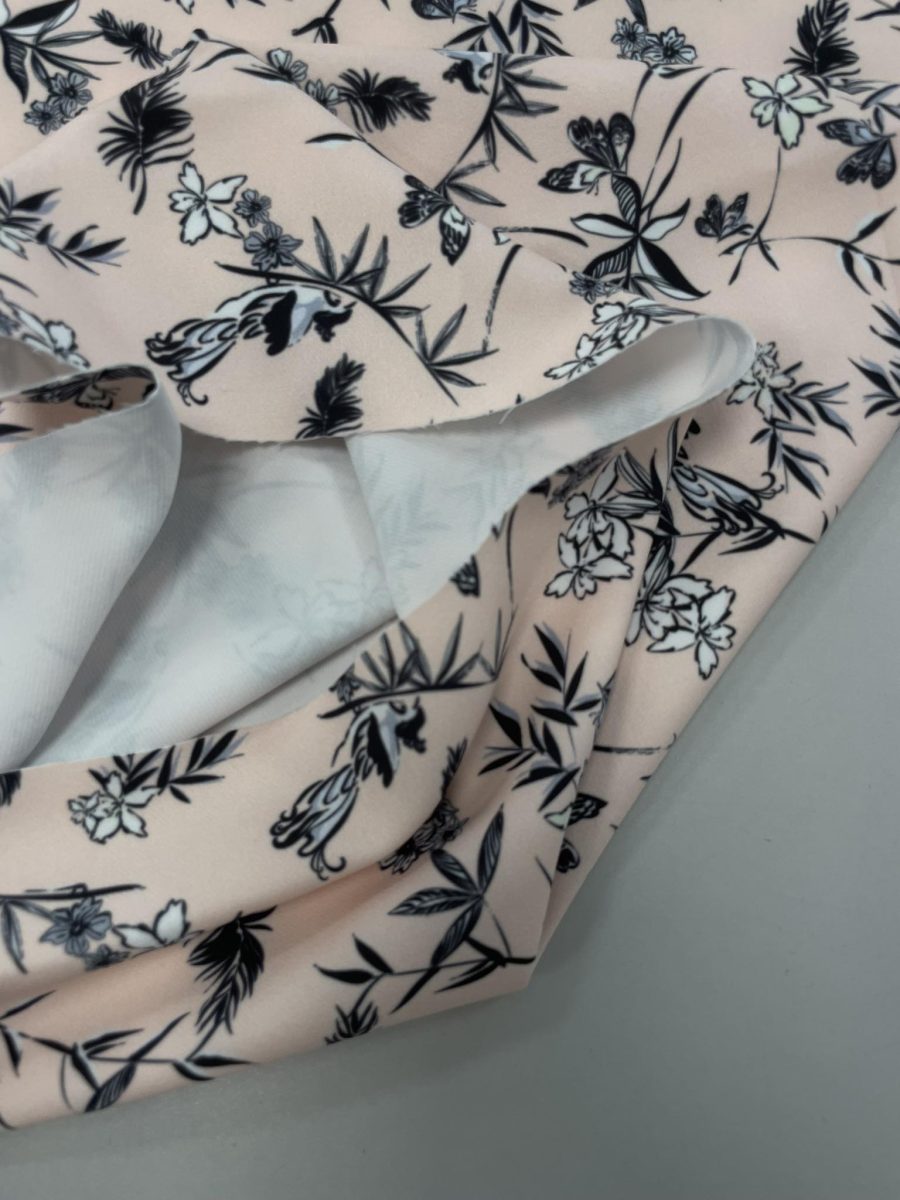 Suknelinis Barbie audinys Rausvas, juodos gėlytės– tai gražiai krentantis, šiek tiek elastingas, nepermatomas, praktiškai nesiglamžantis audinys. Barbie audinys neveltui yra vadinamas sukneliniu, nes pasirinkę jį suknelės siuvimui, o dar priderinus nėrinių ar gipiūro tikrai atrodys elegantiškai ir nereiks rūpintis dėl suknelės glamžymosi. Dar kartais šis audinys yra vadinamas Marchiano audiniu. Barbie medžiagos gramatūra gali būti įvairi, tačiau jis yra pakankamai tankus, nepersišviečiantis. Šį audinį labai lengva prižiūrėti, skalbti nesudėtinga, dėl savo sudėties jis greitai džiūsta. Be suknelių, iš jo galite pasiūti palaidinę, tuniką, sijoną, kelnės. Jis puikiai tiks tiek vasarinių tiek kitų sezonų rūbų siuvimui, tačiau margaspalviais raštais išmargintas barbie idealiausias vasarinei, vėjyje besiplaikstančiai suknelei, palaidinei ar ilgam sijonui.