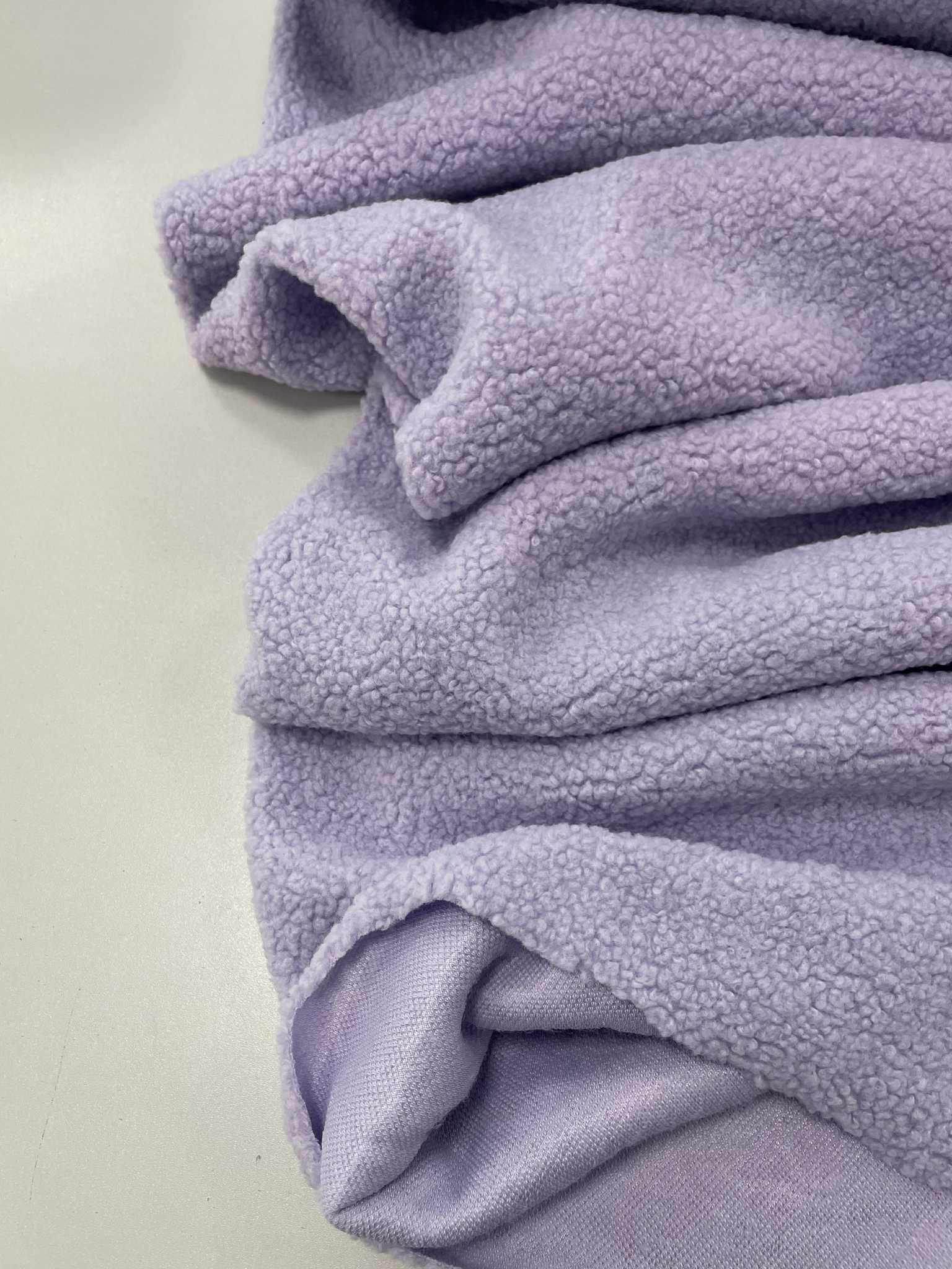 Teddy medžiaga Alyvinė. Tai neilgo plauko dirbtinio pluošto kailiuką primenanti medžiaga. Teddy medžiagos pavadinimas siejamas su žaislinį meškiuką primenančios medžiagos. Turbūt visi esat matė trumpo garbanoto kailio mažą žaislinį meškiuką. Tačiau dabar šios teddy medžiagos panaudojimas yra gerokai platesni snei tik žaisliukų siuvimui. Populiarėja rūbais būtent iš teddy medžiagos, iš jos siuvami ir bliuzonai, sportiniai kostiumėliai, viršutiniai rūbai, taip pat medžiagą naudojama kepurių ir rūbų dekoravimui. Nors medžiagos sudėtyje nėra elastano ji puikiai tempiasi, nes yra trikotažinio pagrindo. Medžiagso mezgimas tvirtas, o plaukas ant teddy medžiagos tankus, garbanotas, malonus liesti.