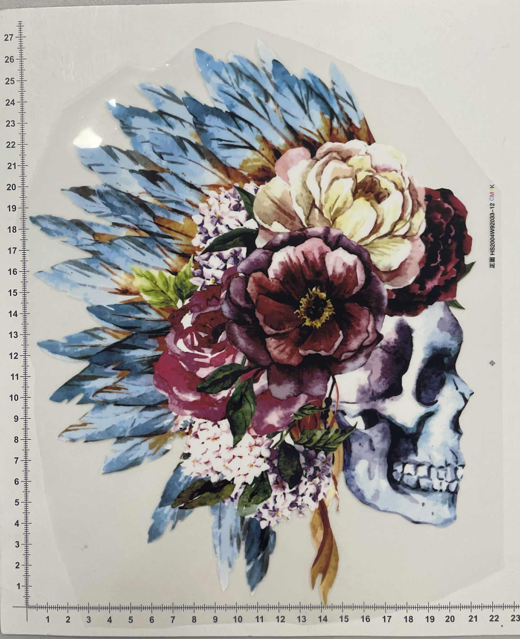Termoaplikacija Kaukolė indėnas, didelė – tai dekoratyvinė aplikacija, prilyginama lygintuvu. Ši aplikacija yra su termo sluoksniu kitoje pusėje. Aplikacija labai lengvai pritvirtinama lygintuvo pagalba – ją tereikia pridėti prie rūbo, o termo sluoksnyje esantys klijai ima lydytis nuo lygintuvo karščio. Alikaciją reikia pridėti prie norimos rūbo vietos, ją būtina uždengti audeklo gabalėliu ir tik tada lyginti karštu 130-150 laipsnių lygintuvu, be garų (apie 20-30 sekundžių).Šios termoaplikacijos tinka dekoruoti visus rūbus: palaidinukes, maikutes, sukneles, tunikas, marškinukus, liemenes, džemperius ar net kepures. Termoaplikacijos naujiems rūbams suteikti puošnumo, žaismingumo, išskirtinumo. Arba priešingai – atnaujina jau padėvėtus rūbus, užlopo nusidėvėjimus arba nepatinkančias rūbo vietas, defektus. Aplikacijos neturi amžiaus cenzo – jos tinka tiek vaikams, tiek ir suaugusiems. Aplikacijos būna įvairių dydžių bei spalvų. Niekada nedėkite lygintuvo tiesiai ant aplikacijos.