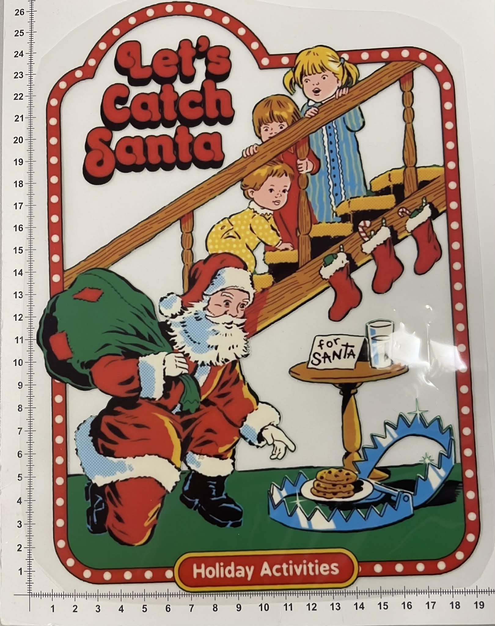 Termoaplikacija Lets Catch Santa, didelė – tai dekoratyvinė aplikacija, prilyginama lygintuvu. Ši aplikacija yra su termo sluoksniu kitoje pusėje. Aplikacija labai lengvai pritvirtinama lygintuvo pagalba – ją tereikia pridėti prie rūbo, o termo sluoksnyje esantys klijai ima lydytis nuo lygintuvo karščio. Alikaciją reikia pridėti prie norimos rūbo vietos, ją būtina uždengti audeklo gabalėliu ir tik tada lyginti karštu 130-150 laipsnių lygintuvu, be garų (apie 20-30 sekundžių).Šios termoaplikacijos tinka dekoruoti visus rūbus: palaidinukes, maikutes, sukneles, tunikas, marškinukus, liemenes, džemperius ar net kepures. Termoaplikacijos naujiems rūbams suteikti puošnumo, žaismingumo, išskirtinumo. Arba priešingai – atnaujina jau padėvėtus rūbus, užlopo nusidėvėjimus arba nepatinkančias rūbo vietas, defektus. Aplikacijos neturi amžiaus cenzo – jos tinka tiek vaikams, tiek ir suaugusiems. Aplikacijos būna įvairių dydžių bei spalvų. Niekada nedėkite lygintuvo tiesiai ant aplikacijos.