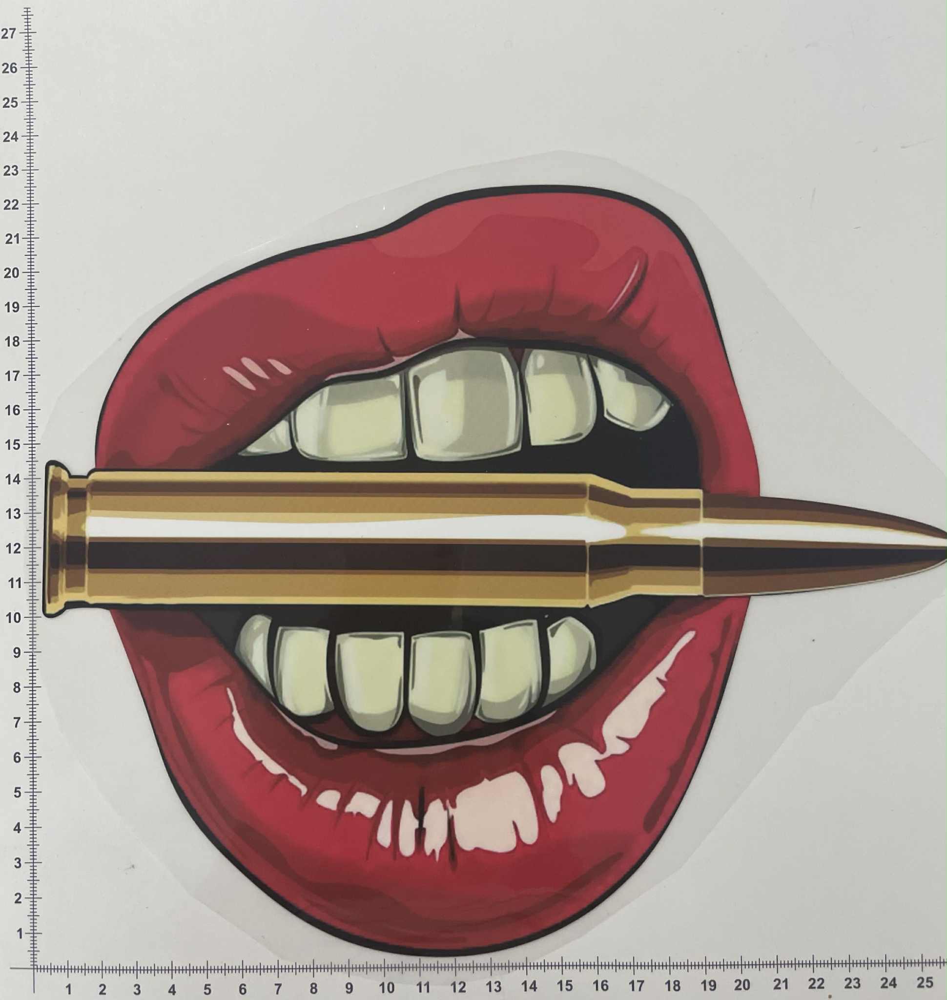 Termoaplikacija Lūpos ir kulka, didelė – tai dekoratyvinė aplikacija, prilyginama lygintuvu. Ši aplikacija yra su termo sluoksniu kitoje pusėje. Aplikacija labai lengvai pritvirtinama lygintuvo pagalba – ją tereikia pridėti prie rūbo, o termo sluoksnyje esantys klijai ima lydytis nuo lygintuvo karščio. Alikaciją reikia pridėti prie norimos rūbo vietos, ją būtina uždengti audeklo gabalėliu ir tik tada lyginti karštu 130-150 laipsnių lygintuvu, be garų (apie 20-30 sekundžių).Šios termoaplikacijos tinka dekoruoti visus rūbus: palaidinukes, maikutes, sukneles, tunikas, marškinukus, liemenes, džemperius ar net kepures. Termoaplikacijos naujiems rūbams suteikti puošnumo, žaismingumo, išskirtinumo. Arba priešingai – atnaujina jau padėvėtus rūbus, užlopo nusidėvėjimus arba nepatinkančias rūbo vietas, defektus. Aplikacijos neturi amžiaus cenzo – jos tinka tiek vaikams, tiek ir suaugusiems. Aplikacijos būna įvairių dydžių bei spalvų. Niekada nedėkite lygintuvo tiesiai ant aplikacijos.