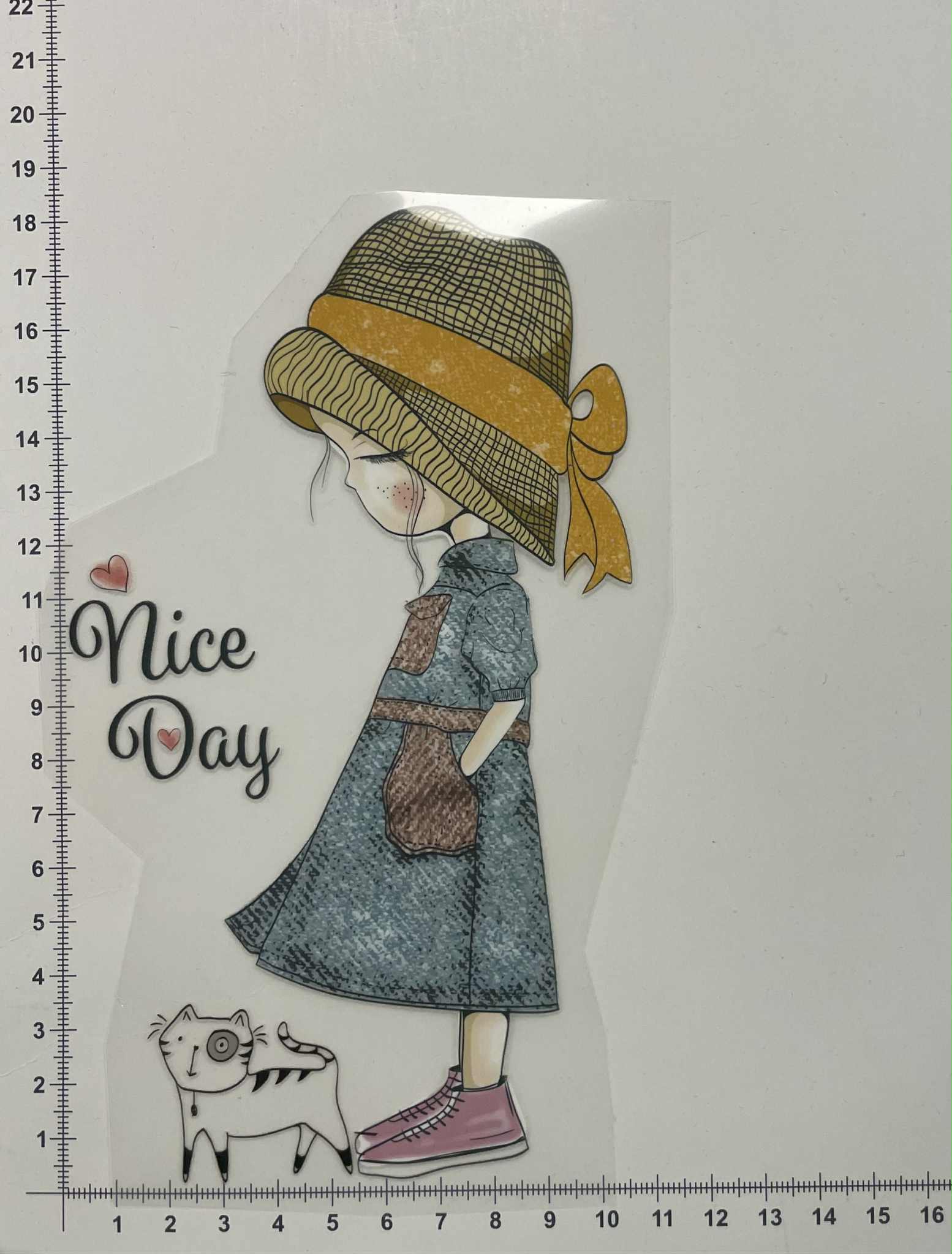 Termoaplikacija Mergaitė su katinuku – tai dekoratyvinė aplikacija, prilyginama lygintuvu. Ši aplikacija yra su termo sluoksniu kitoje pusėje. Aplikacija labai lengvai pritvirtinama lygintuvo pagalba – ją tereikia pridėti prie rūbo, o termo sluoksnyje esantys klijai ima lydytis nuo lygintuvo karščio. Alikaciją reikia pridėti prie norimos rūbo vietos, ją būtina uždengti audeklo gabalėliu ir tik tada lyginti karštu lygintuvu, su garais (apie 20-30 sekundžių).Šios termoaplikacijos tinka dekoruoti visus rūbus: palaidinukes, maikutes, sukneles, tunikas, marškinukus, liemenes, džemperius ar net kepures. Termoaplikacijos dažniausiai naudojamos: naujiems rūbams suteikti puošnumo, žaismingumo, išskirtinumo. Arba priešingai – atnaujinti jau padėvėtus rūbus, užlopyti nusidėvėjimus arba nepatinkančias rūbo vietas, defektus. Aplikacijos neturi amžiaus cenzo – jos tinka tiek vaikams, tiek ir suaugusiems. Aplikacijos būna įvairių dydžių bei spalvų. Niekada nedėkite lygintuvo tiesiai ant aplikacijos.