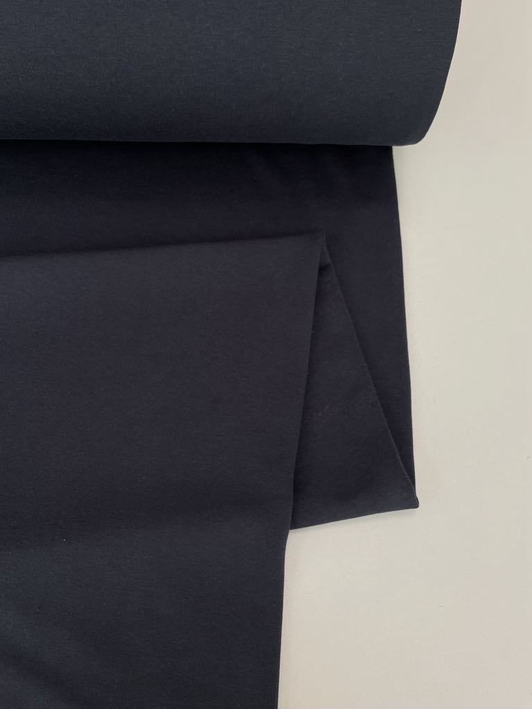 Trisiūlis kilpinis trikotažas Labai Tamsiai Mėlynas. šiuo metu itin populiarėjantis trikotažo rūšis. Trisiūlis kilpinis trikotažas kaip ir paprastas kilpinis trikotažas yra viengubo mezgimo medžiaga, tačiau kitaip nei paprastas trikotažas, trisiūlis trikotažas antroje pusėje turi stambias iškilias kilpas ir dažniausiai būna mezgamas vien iš medvilnės, arba medvilnės ir polisterio, be elastano sudėtyje. Tinka siūti laisvalaikio rūbams: sportiniams kostiumams, tunikoms, palaidinukėms, džemperiams, kelnėms. Trisiūlis kilpinis trikotažas yra neplonas, tvirtas, sertifikuotas ir kokybiškas, todėl tinka įvairių rūbų siuvimui ne tik suaugusiems, bet ir vaikams bei kūdikiams. Iš šios medžiagos pasiūti drabužiai malonūs dėvėti, patvarūs, paprastai skalbiami ir puikiai sugeriantys bei išgarinantys drėgmę, leidžiantys kūnui kvėpuoti. Pagrindinis medvilnės privalumas – higieniškumas, todėl puikiai tinka drabužiams, kurie tiesiogiai liečiasi su žmogaus kūnu. Medžiaga labai praktiška, nereikalauja ypatingos priežiūros. Net ir dažnai skalbiant, bet tinkamai naudojant ir prižiūrint ši medžiaga ilgai išlaikys pradinę spalvą, formą ir išliks kokybiška. Nors medvilnė yra tvirta ir atspari skalbimui, rekomenduojame gręžti kuo mažiausiomis apsukomis, kad nesusimestų sunkiai išlyginamų raukšlių. Kilpinis trikotažas Juodas nesielektrina.