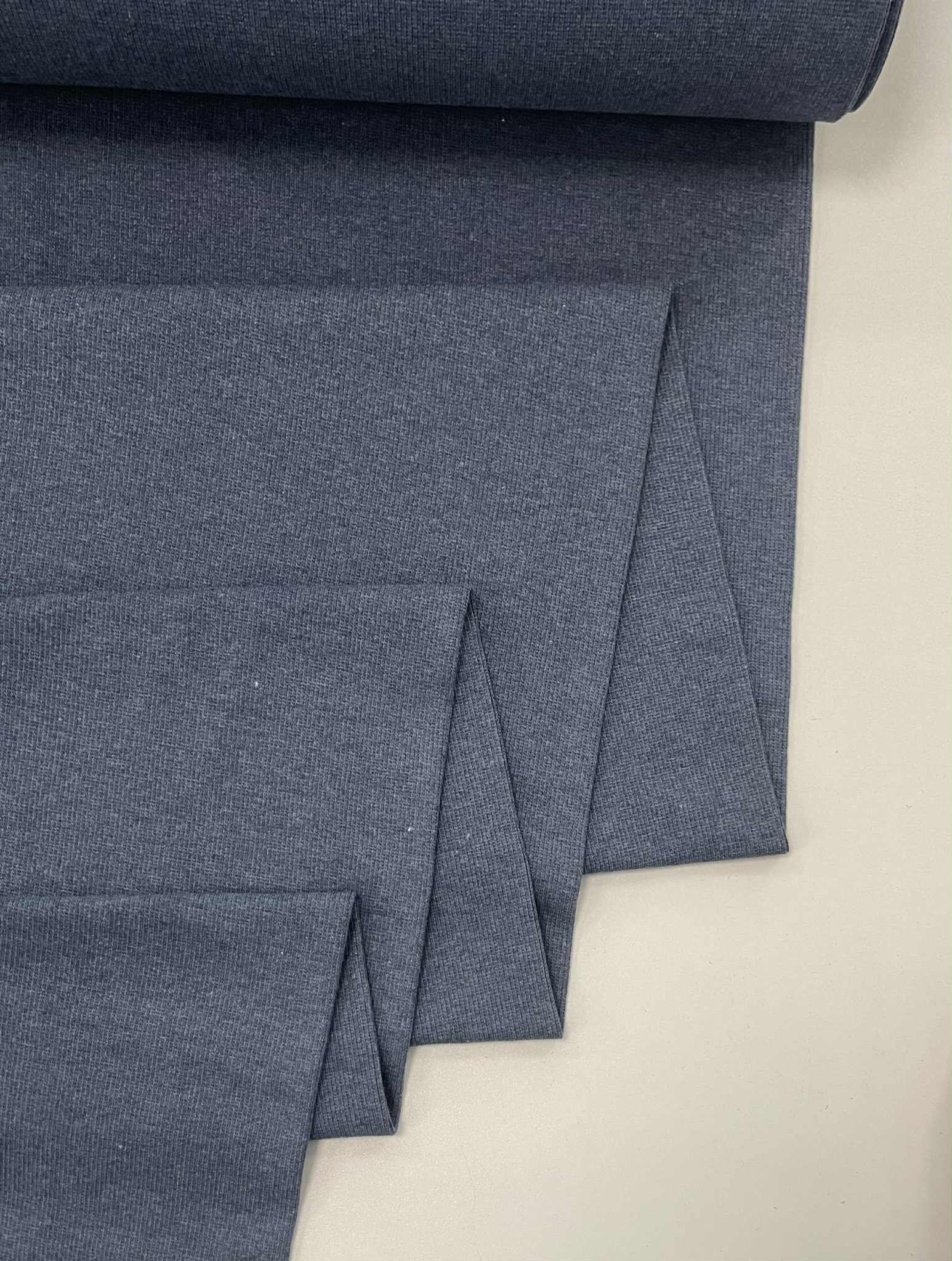 Vidutinio storumo rib trikotažas Džinsinis Melanžas – labai elastingas medvilninis audinys, panašus į megztą gumą. Audinys gaminamas iš medvilnės, tačiau jo sudėtyje yra nemažai elastano. Elastanas suteikia audiniui daugiau tamprumo, o pasiūtam rūbui padeda išsaugoti pradinę formą. Rib trikotažas ne tik natūralus bei malonus audinys, bet ir gerai sugeria bei išgarina drėgmę. Šis trikotažas dažniausiai naudojamas rūbų apdailai – rankogaliams, apykaklėms, kelnių klešnių apačioms užbaigti, ir pan. Kelnių juosmuo, apsiūtas šiuo elastingu trikotažu laikysis tvirčiau ant klubų. Pižamos rankogaliai ir kelnių apačia apsiūta tampriu trikotažu vaikučiui nesmuks ir jo neerzins, vaikas jausis patogiai ir maloniai. Tačiau iš šios medžiagos galima siūti ir sukneles, golfus, sijonus, bliuzonus, kepures. Rūbai iš šio trikotažo nesiglamžo, išskalbus išlaiko savo pradinę formą ir spalvą. Rib trikotažas – tai aukščiausios kokybės, vidutinio storumo, tačiau ypatingai tamprus, minkštas, tvirtas ir malonus trikotažas. Kadangi šis trikotažas yra sertifikuotas, todėl tinkamas siūti ne tik suaugusiųjų rūbams, bet ir vaikams bei kūdikiams. Šis Rib trikotažas yra vidutinio storumo, tinka vasariniams rūbams.